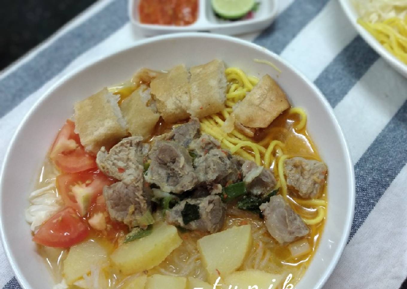 - Tata mie, bihun, kol masukkan kuah kaldu+daging sajikan bersama bahan pelengkap