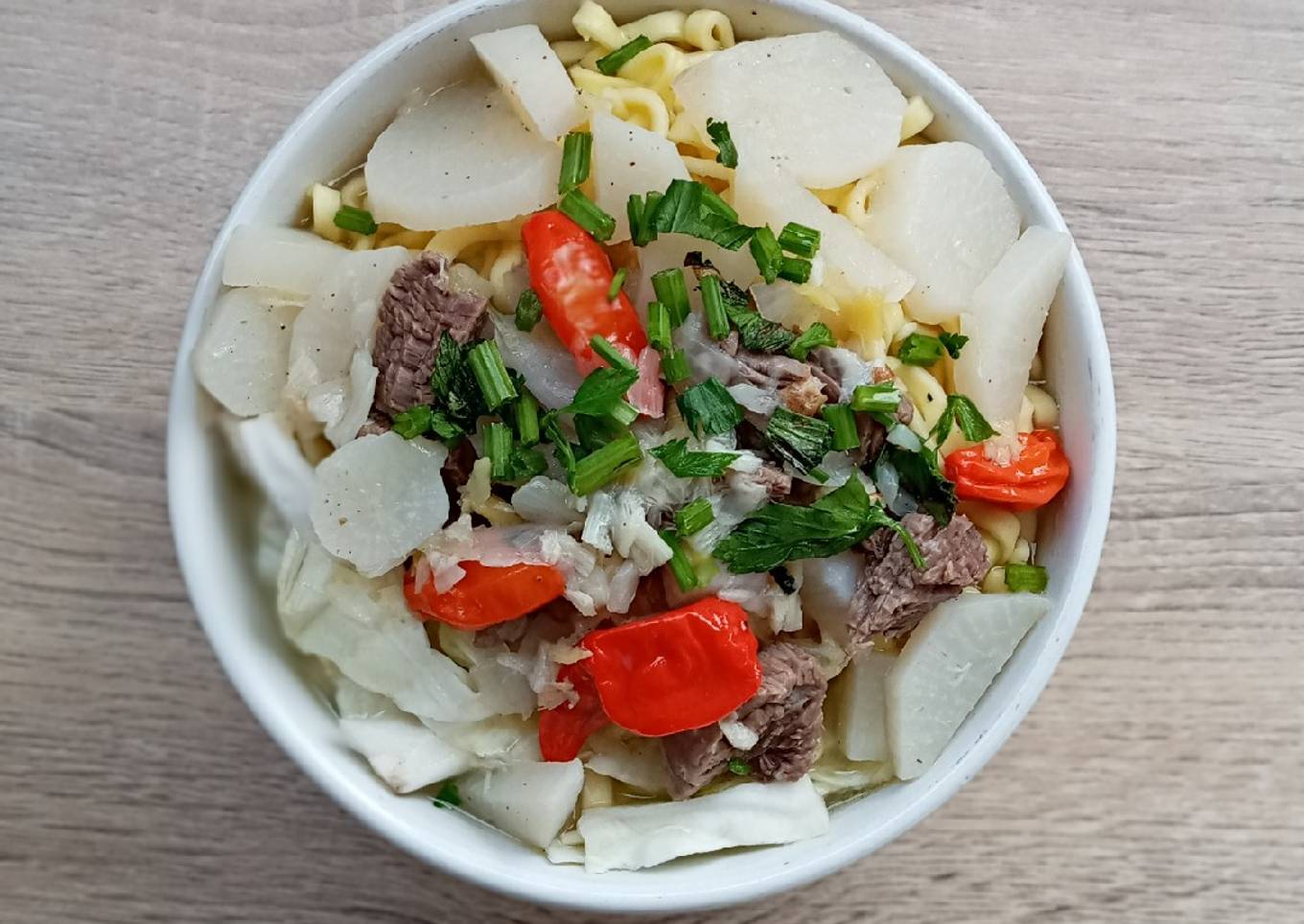 - Masukan mie basah ke mangkok saji, kol dan tomat