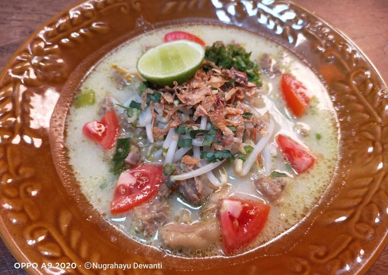 - Taruh soto dalam mangkok lalu tambahkan atasnya dengan taoge rebus, irisan tomat, irisan daun bawang, bawang goreng dan sambel. Kucuri atasnya dengan air perasan jeruk nipis. Sajikan bersama dengan nasi hangat.