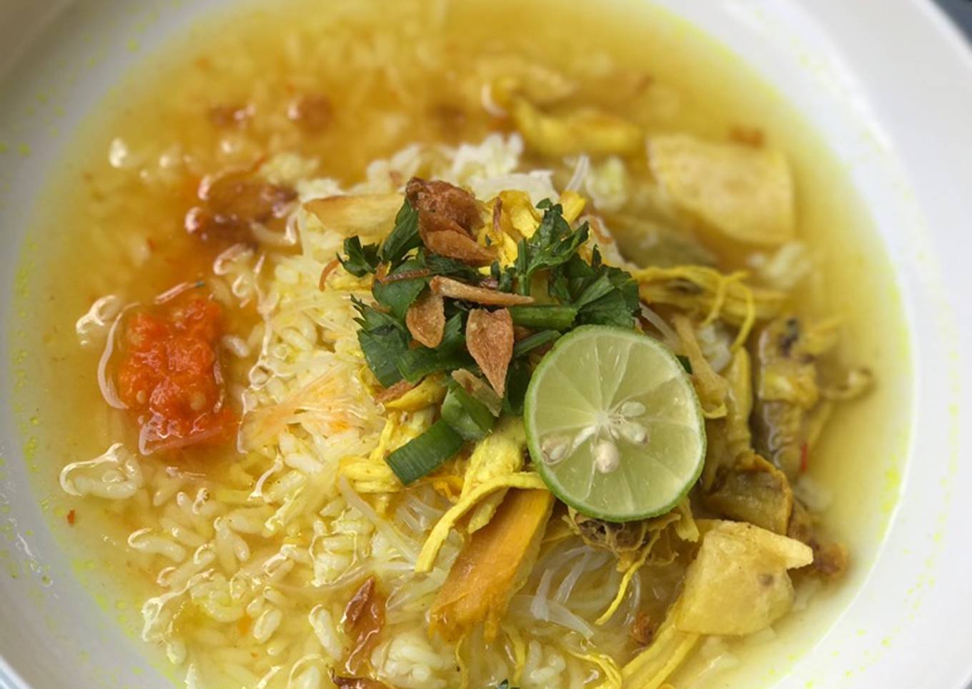 - Koreksi rasa, sajikan dengan soun, bawang goreng, sledri, bawang daun, jeruk nipis, dan sambal
