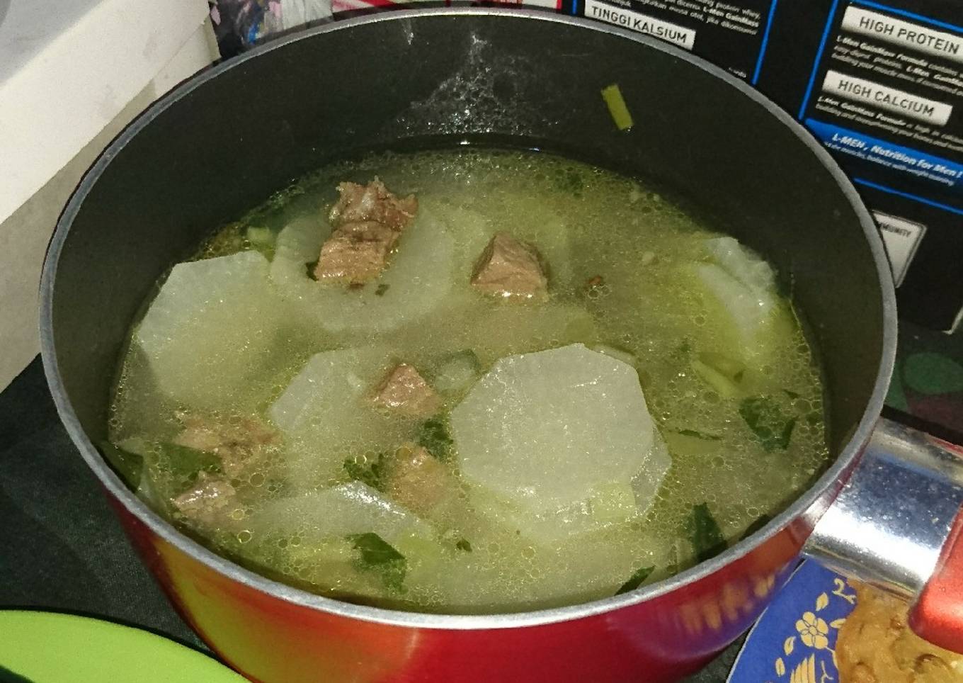 - Masukkan potongan daging dan lobak, tambahkan garam, gula, royco, bawang daun, dan seledri, kemudian cek rasa