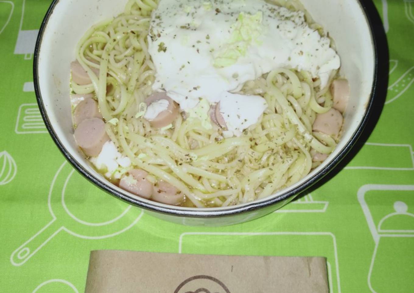 - Tambahkan potongan sosis, telur ayam & air sesuai selera. Menu siap disajikan.