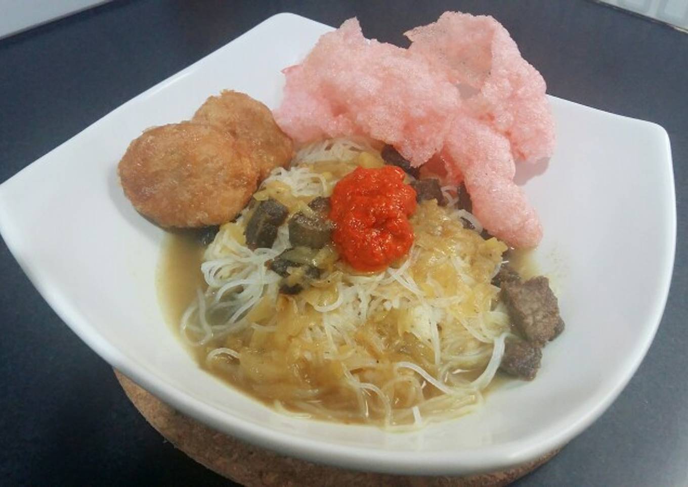 - ...kemudian siram dengan kuah soto panas, aduk rata