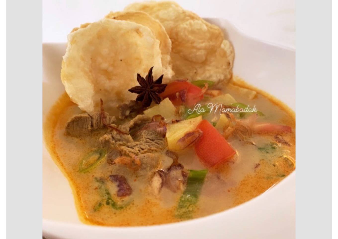 - Rebus air dan daging hingga mendidih, lalu masukkan bahan tumisan diatas. Tambahkan seasoingnya. Aduk biarkan hingga mendidih lalu tambahkan susu dan santan. Tambahkan irisan tomat. Koreksi rasa.