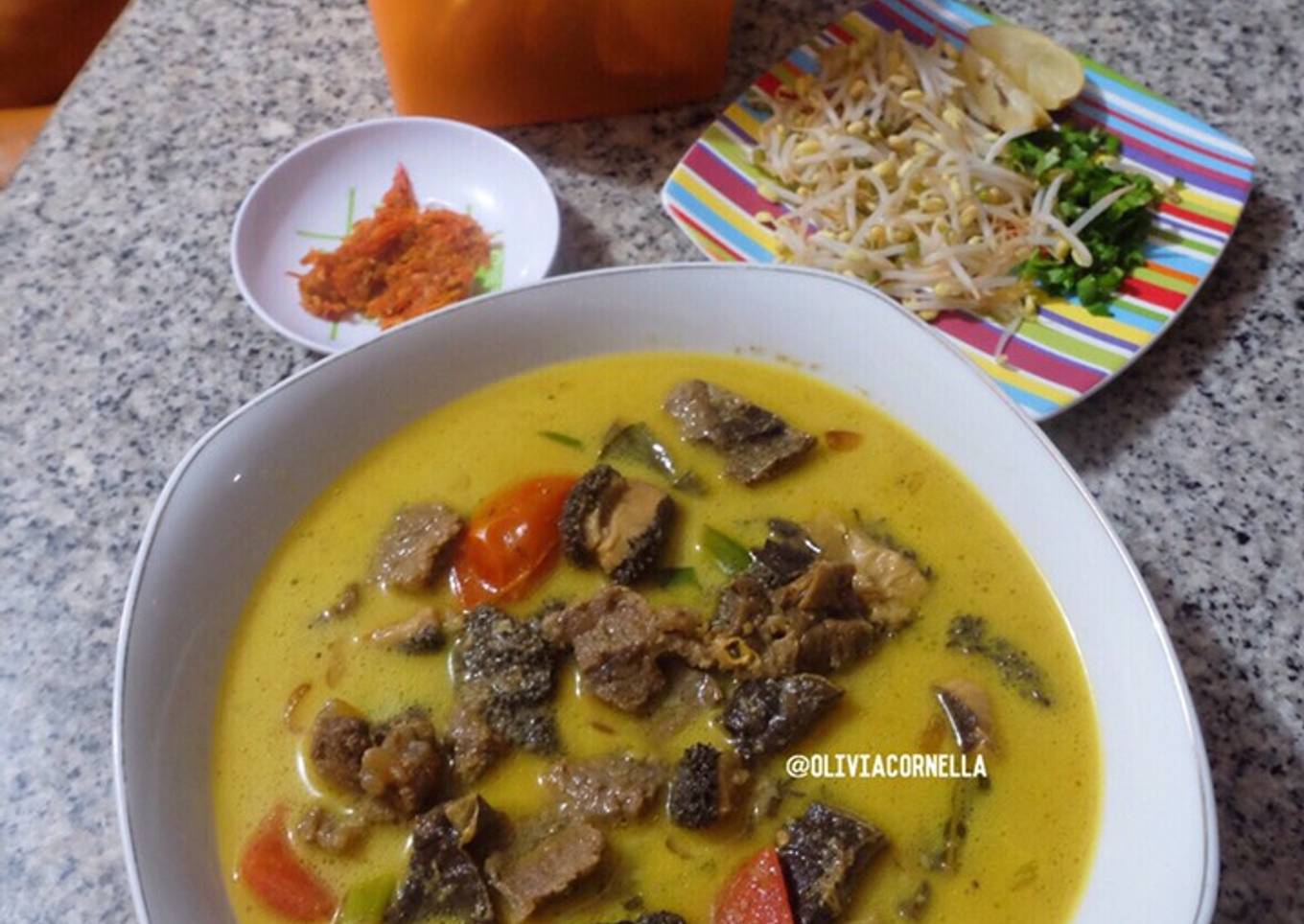 - Tambahkan daging & jeroan sapi yg sudah direbus empuk dan dipotong2. Tuangkan kaldu sapi, kayu manis, merica, penyedap rasa, garam. Koreksi rasa