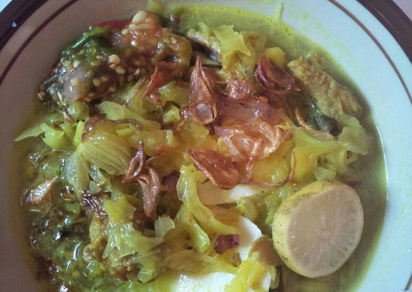 - Kemudian siram sama bumbu sotonya tambahkan jeruk nipis dan bawang goreng..