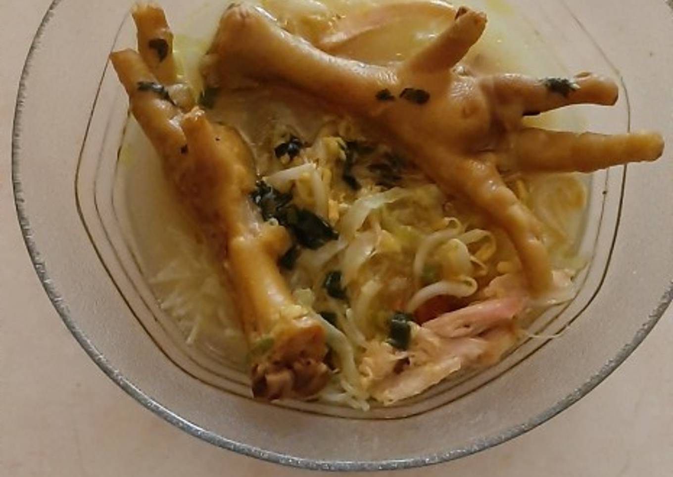 - Sajikan bihun, tauge dan kol serta kuah soto ceker dan cekernya. Untuk menambahkan penyedap bisa tabur bawang goreng.