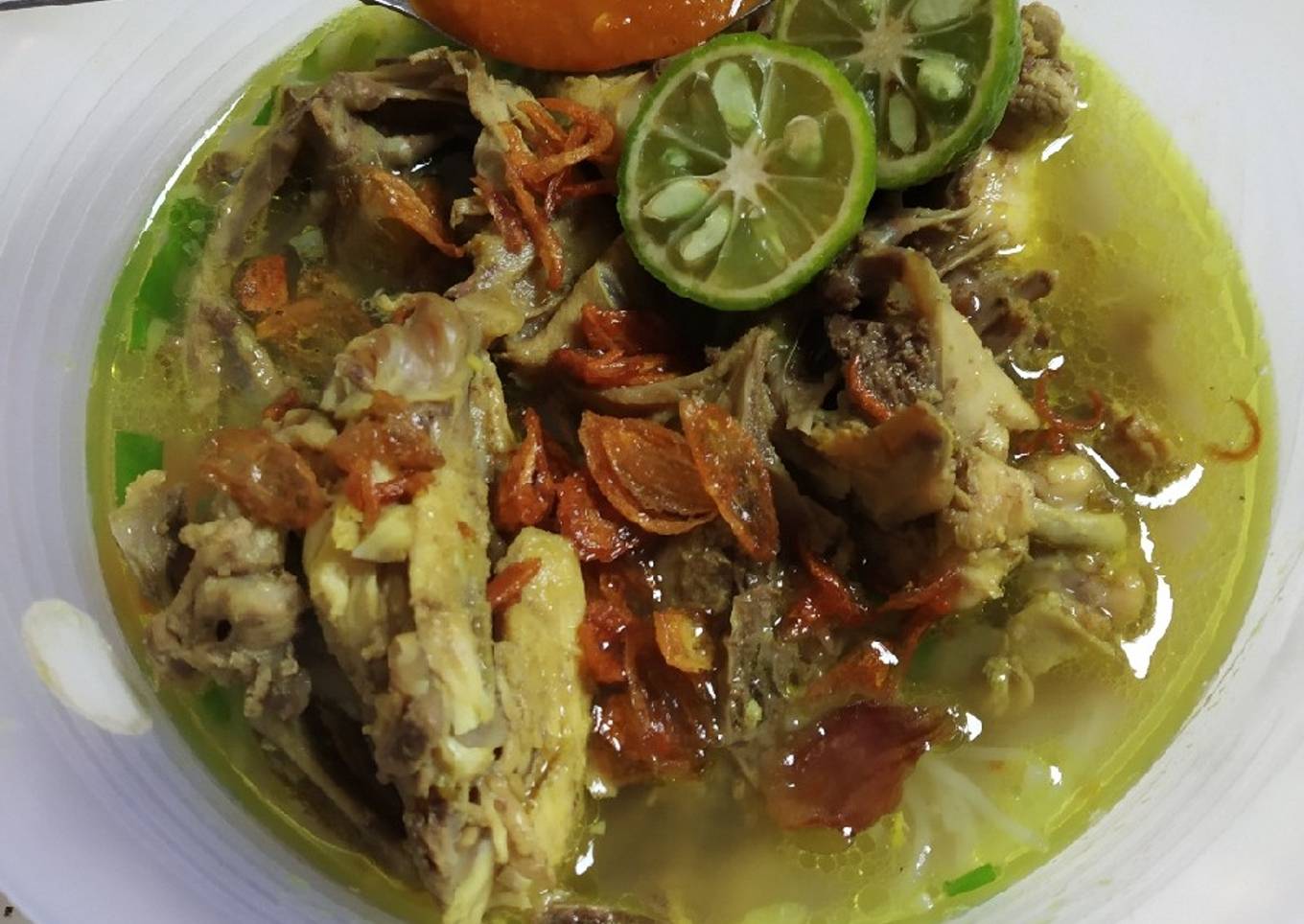 - Sajikan bersama irisan daun bawang, kol, tomat, bawang goreng, toge, soun, jeruk nipis, n sambal