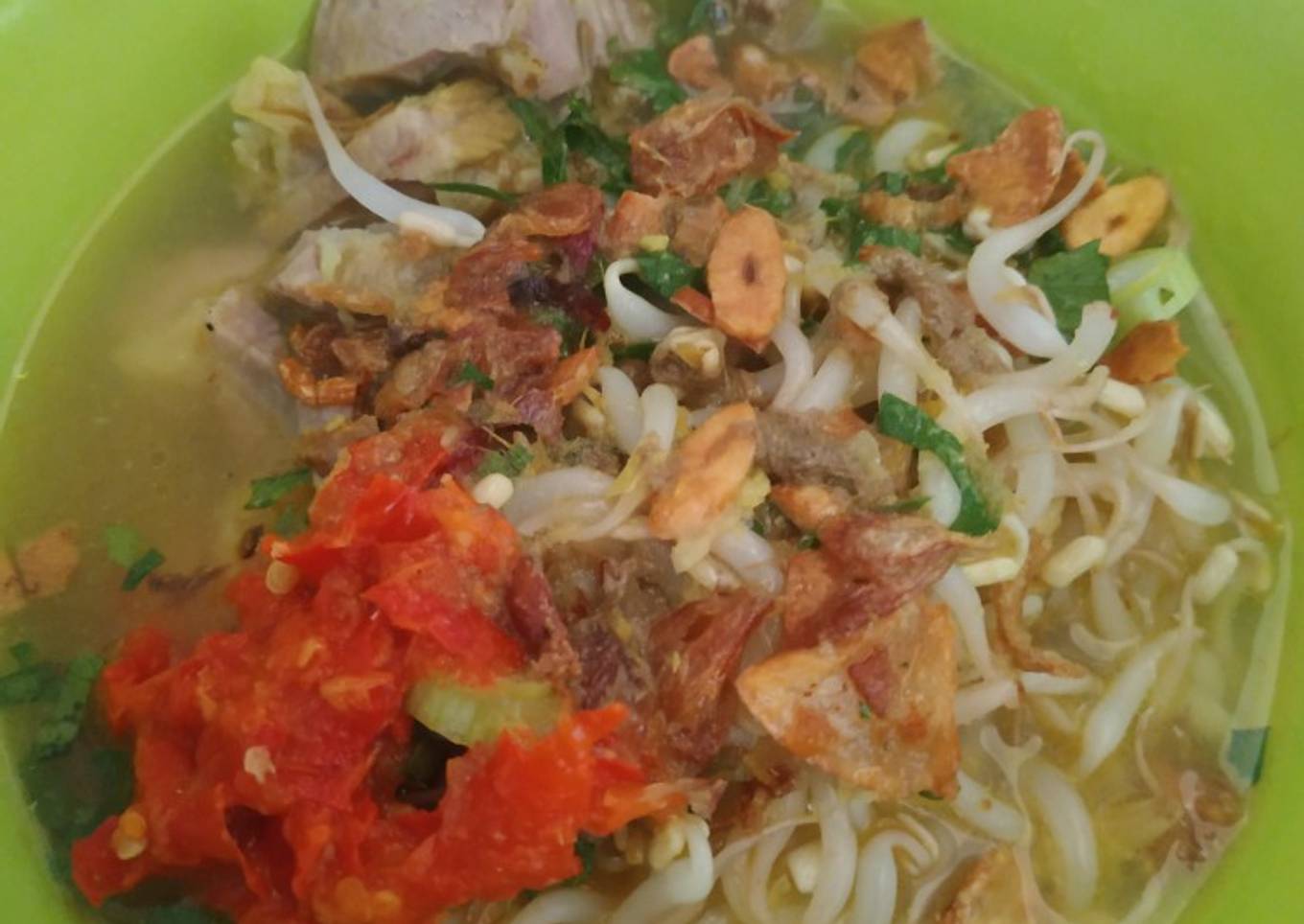 - Tata toge di mangkuk, tmbh kan potongan daging, daun bawang, bawang goreng, sambal. Terakhir masukkan kuah. Dijamin suegerrrr bun.... 😊😊