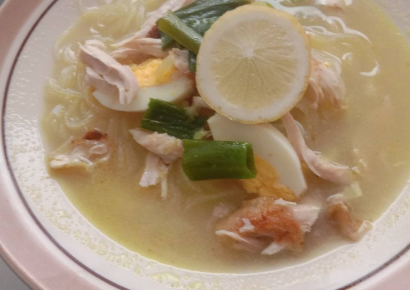 - Goreng ayam yg tadi (jangan terlalu kering) angkat lalu suir ayam sesuai selera, kemudian Susun irisan kol, ayam yg telah disuir, soun kaca yg telah direndam sebelumnya dan potongan telor kedalam piring siram dengan kuah soto, bila suka beri perasan jeruk lemon. selamat makan siang