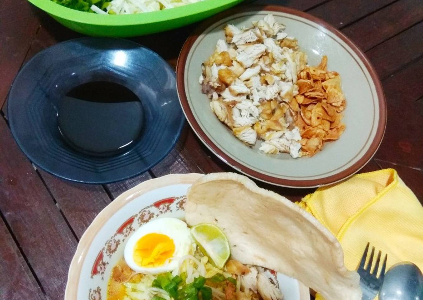 - Tata nasi dalam mangkuk beri bahan pelengkapnya dan bawang putih goreng lalu siram dengan kuah soto. Soto kudus siap dinikmati 😄