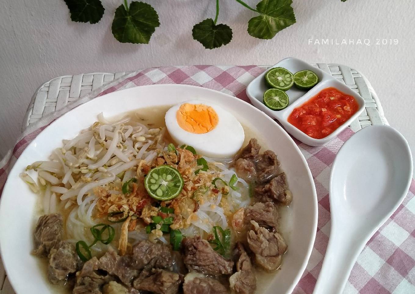 - Siapkan mangkuk, taruh bihun, toge, telur dan daun seledri. Siram dengan kuah dan daging. Beri taburan bawang goreng. Beri air perasan jeruk limau, sambal soto dan kecap manis kalau suka.