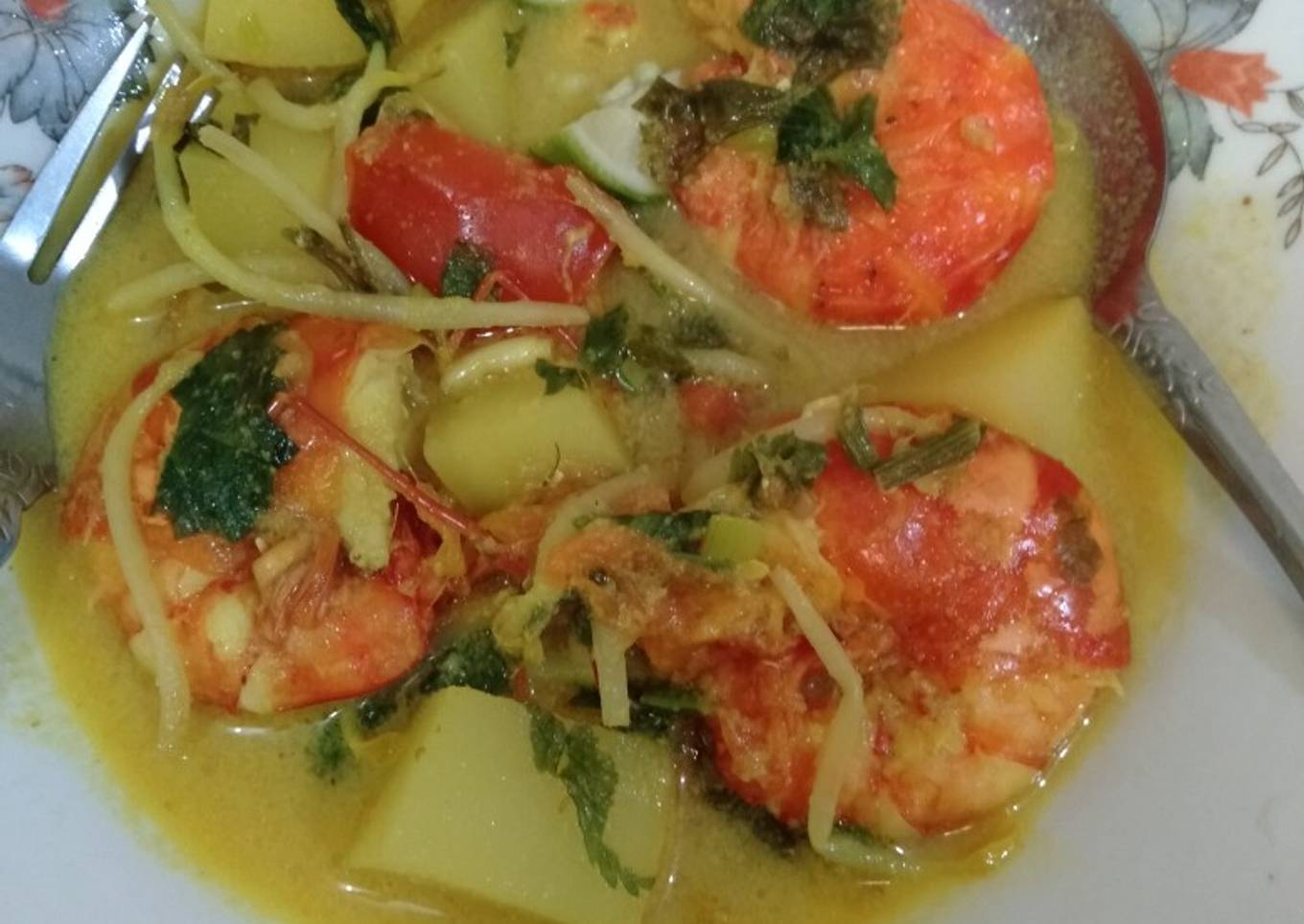 - Tambahkan santan,tomat,daun jeruk,lalu masukan udang,gula,garam,serta daun seledri