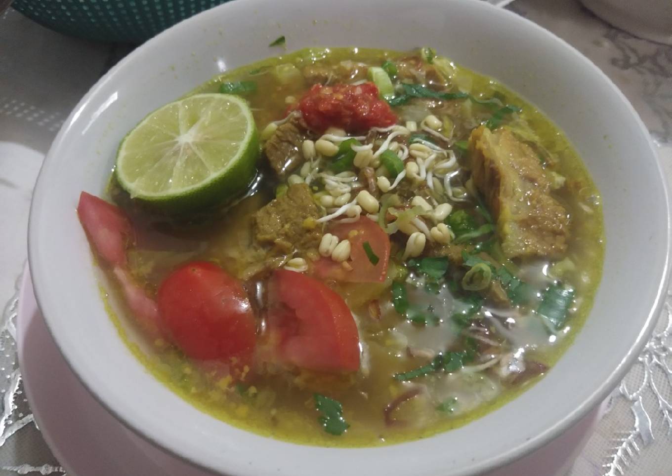 - Siap di hidangkan bersama pelengkap,Siapkan mangkok,taruh tauge,kol,kentang goreng,tomat,tuangkan kuahnya dan potongan dagingnya,lalu taburi tauge pendek dan bawang goreng,sambal rebus