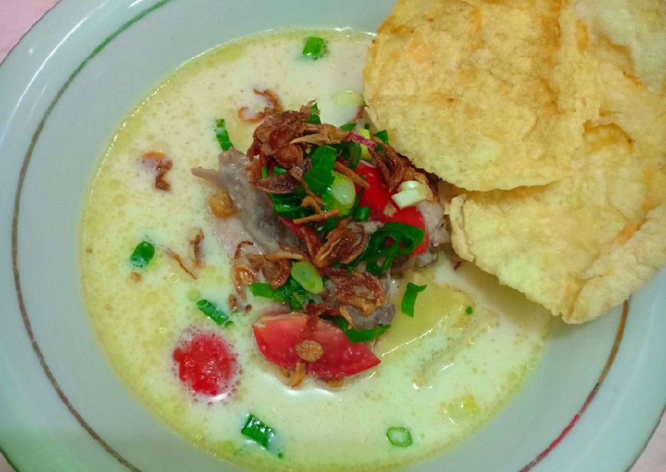 - Iris" daging,kentang masukan kuah soto beri irisan daun bawang dan tomat,taburi bawang goreng.siap disajikan