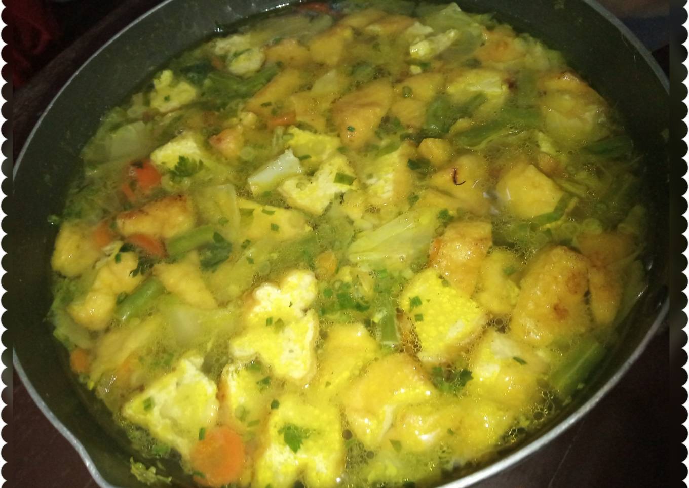 - Tuangkan air tunggu smpai ber gelembung lalu masukkan semua sayuran, tunggu smpai layu di tambah tahu goreng, seledri, daun bawang,tomat,masako.