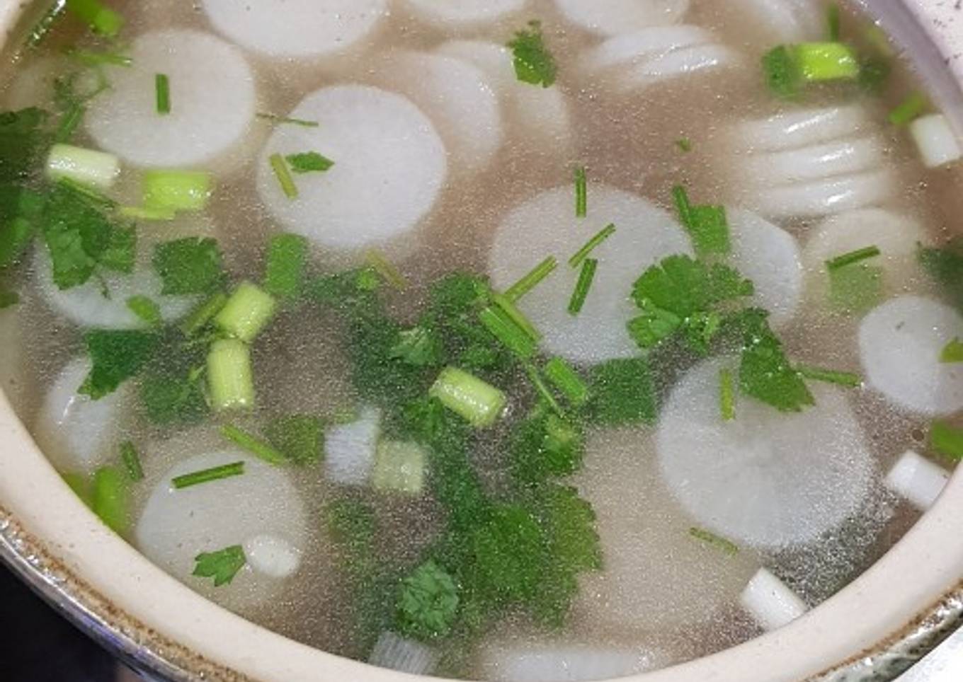 - Terakhir masukkan lobak sampai empuk. Koreksi rasa. Beri daun seledri dan daun bawang.